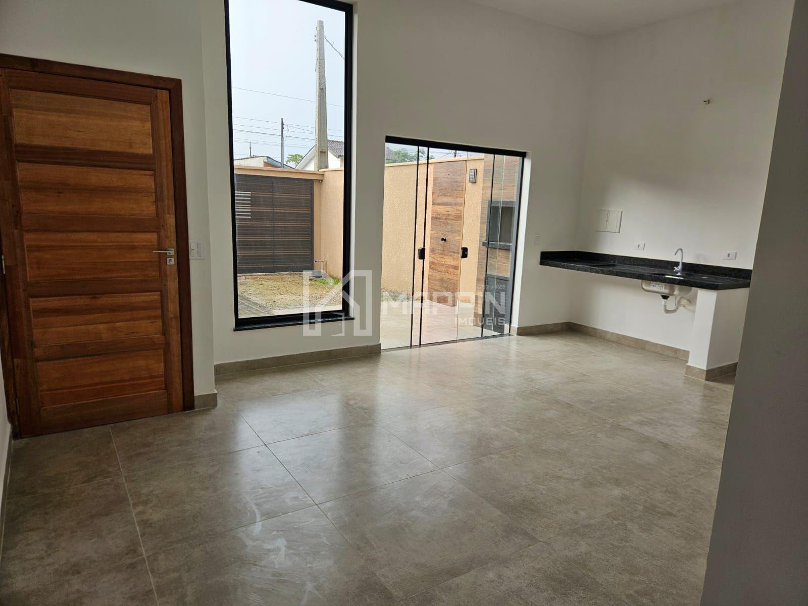 A casa possui ampla sala para dois ambientes (estar e jantar), integrada a uma cozinha em conceito americano, criando um ambiente moderno e funcional para o dia a dia.